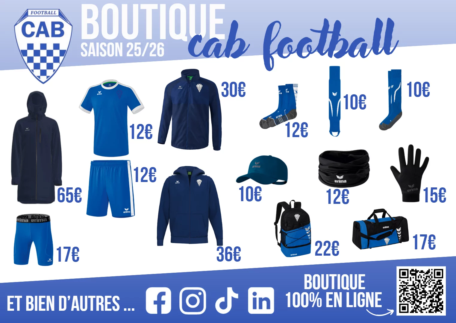 Du maillot domicile au survêtement d’entraînement, en passant par les accessoires, la boutique officielle du CAB Football vous permet d’afficher votre passion et votre attachement au club, sur et en dehors des terrains.
